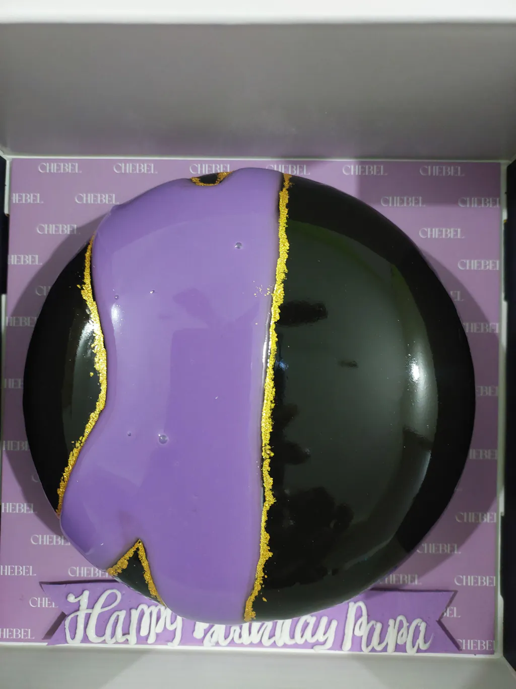 Chebel Signature - Dutch Chocolate Mousse Cake - A chocolate almond genoise cake layered with 64% chocolate mousse with a hazelnut praline & feuilletine base, it is enrobed in a with a glossy cocoa noir and our signature purple mirror glaze.